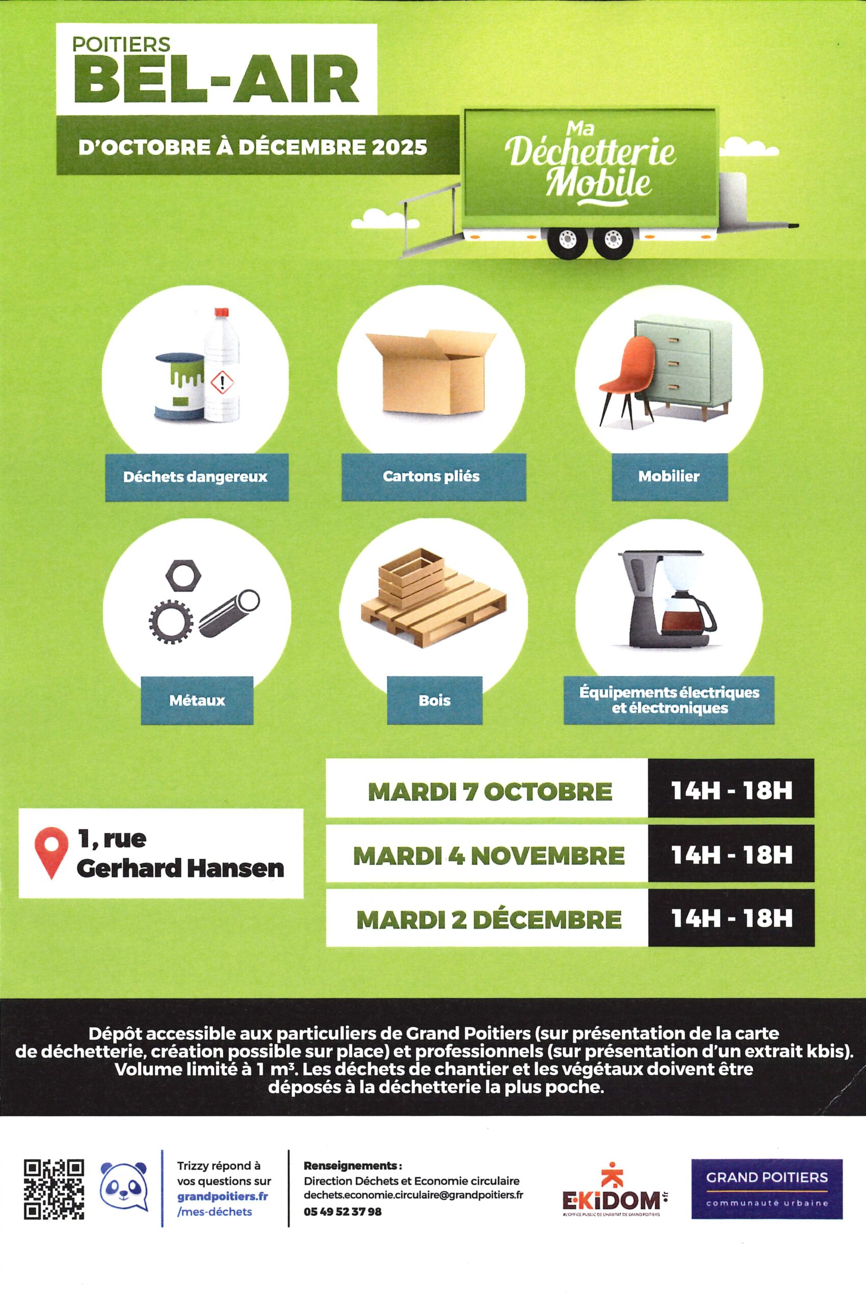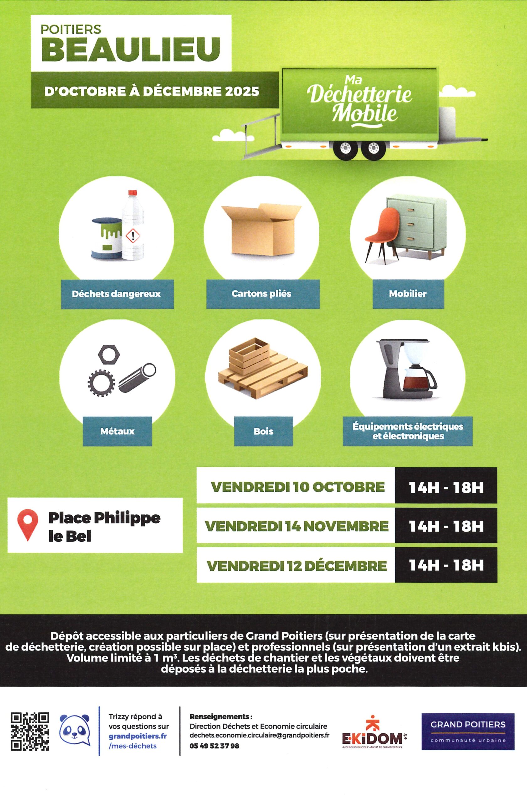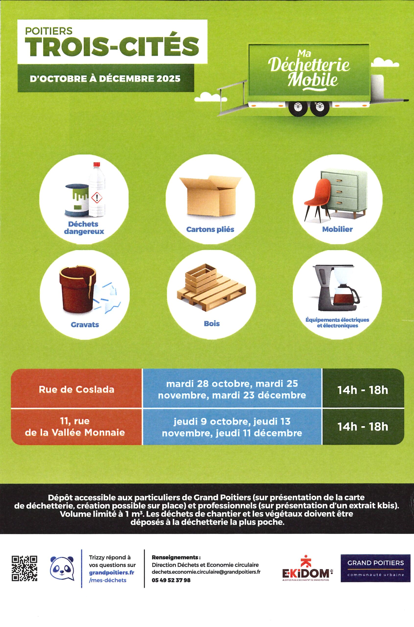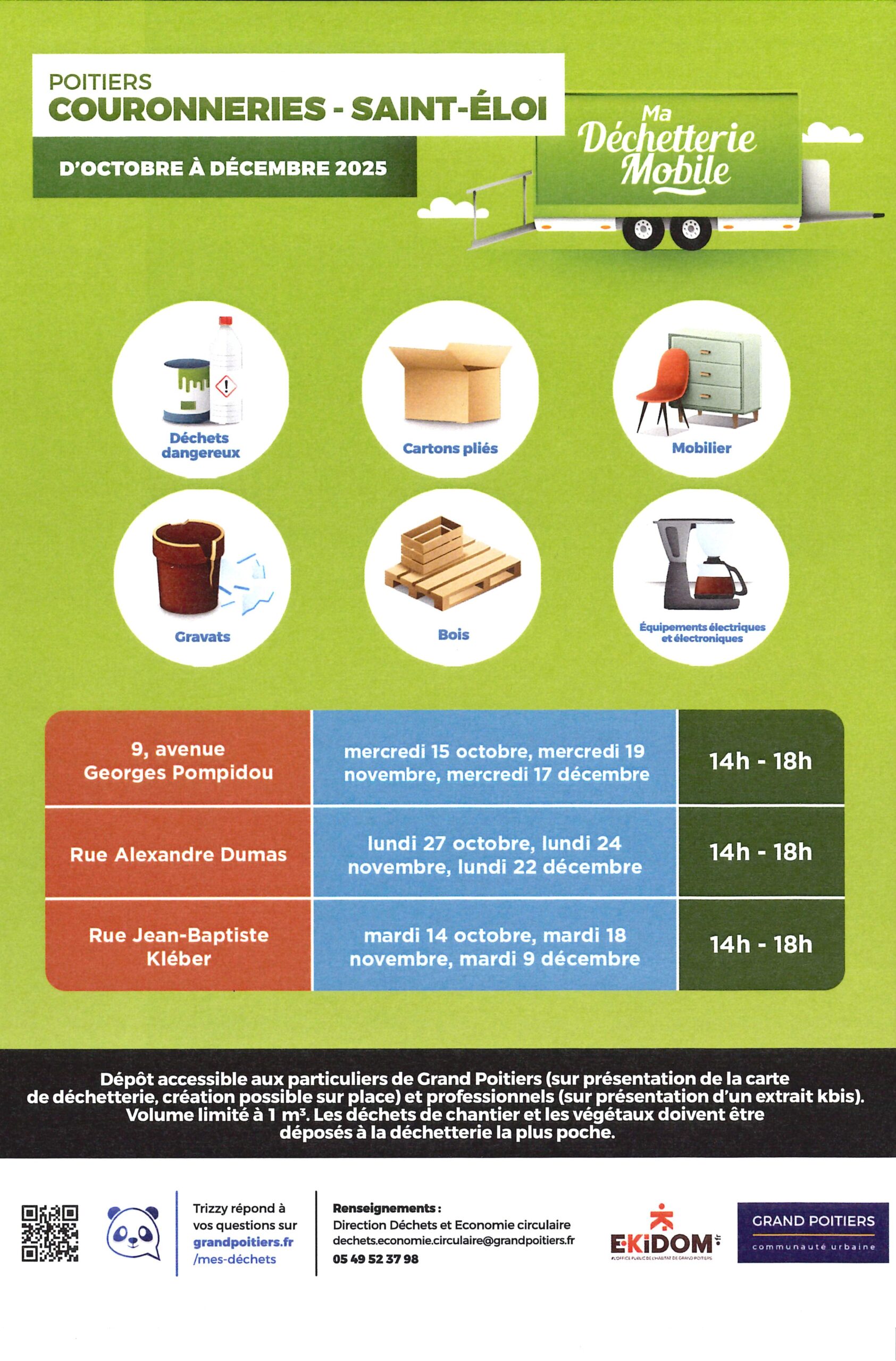 EKIDOM, en tant que 1er bailleur de Grand Poitiers et acteur majeur du territoire, s’associe à Grand Poitiers pour vous communiquer les dates de passage du service mobile de gestion des déchets et encombrants de la Communauté Urbaine : la déchetterie mobile.